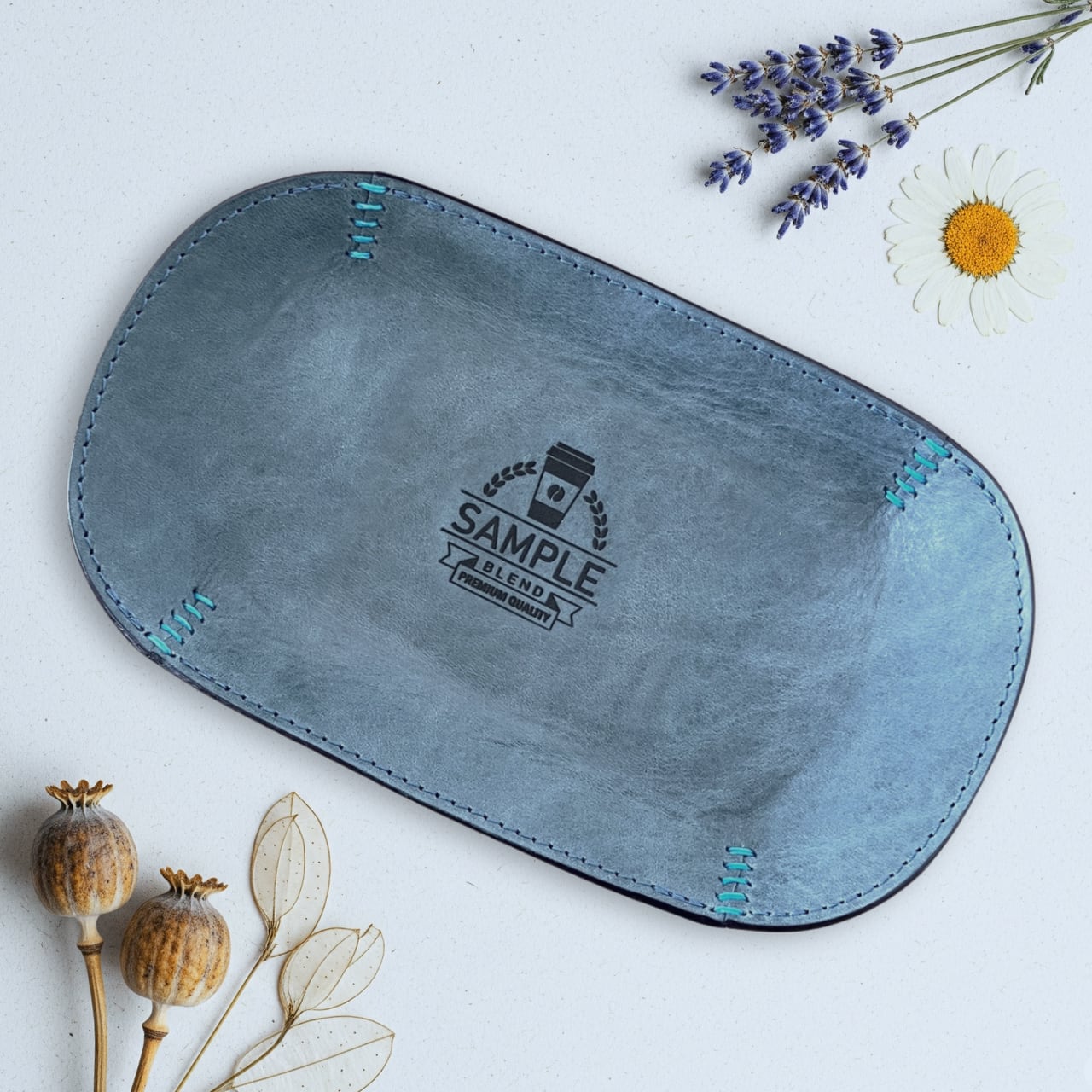 【送料無料】ロゴ刻印・メッセージ入れ可|本革キャッシュトレイ(サックスブルー)|開店祝い・店舗ギフト・マネートレイ
